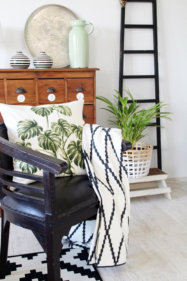 Pflanzenkissen, Herbsttrend, Antike Kommode, schwarze Leiter, schwarzweiß Plaid, Monstera, Dekoideen, Kissen