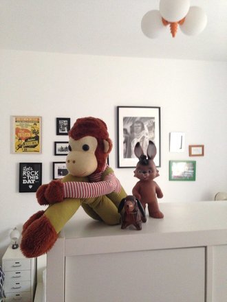 Mein Lieblingsstück aus meiner Kindheit ist dieser Affe. Ich habe immer gerne mit ihm gespielt ☺ Heute darf das meine Tochter, denn meine Eltern haben fast alles von uns Kindern auf dem Speicher, so dass wir eigentlich nichts Neues brauchen. Trotzdem kann ich mich weder klar zu Team Neu oder Vintage einordnen. 😊