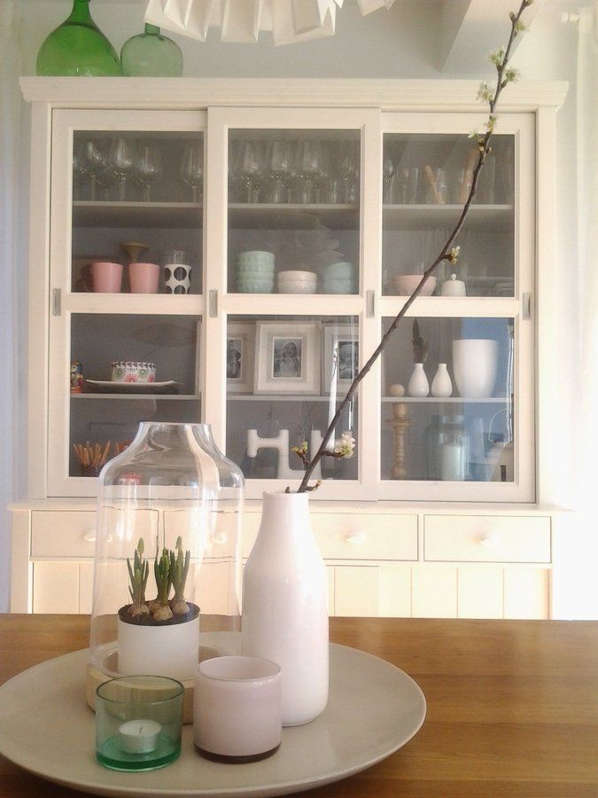 Tisch, Holztisch, Esstisch, Vitrine, Buffetschrank, Frühling, Vase, Pastell, Esszimmer