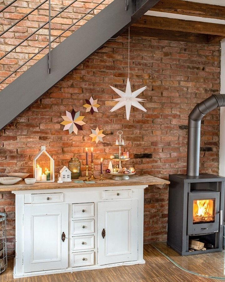Esszimmer, Backsteinwand, Kamin, Ofen, Kommode, Diy, Weihnachtsdeko, Deko, Treppe