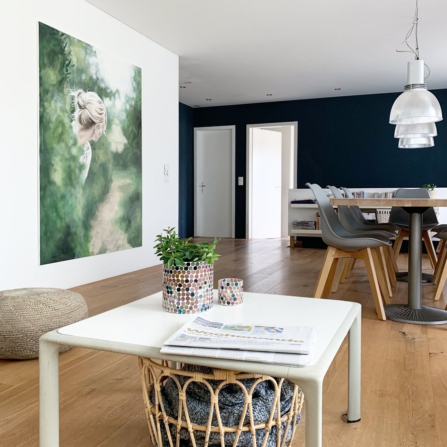 Wohnzimmer, Esszimmer, Bild, Wandbild, Dunkle Wand, Eichenparkett, sommerbild, Gartenliebe, Pflanzenliebe