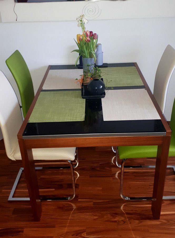 Esstisch, Lederstühle, Grün, Creme, Blau