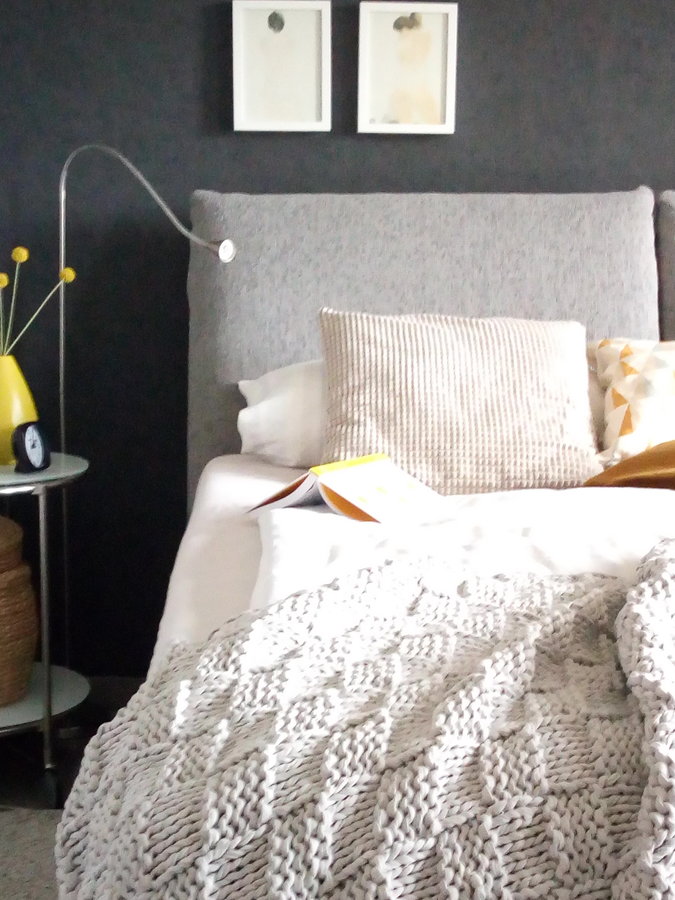 schwarze Wand, Grau und gelb, Schlafzimmer, Bett, Plaid, DIY, Kissen, Kuschelzone, Rückzugsort