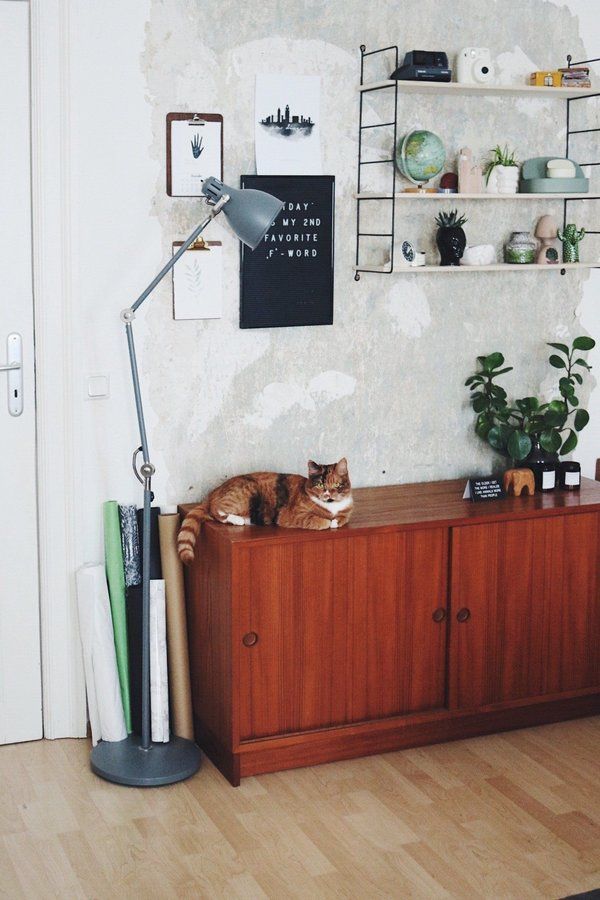 Wohnzimmer, Vintage, Mid century, Katze, Betonwand, Wandgestaltung Wohnzimmer