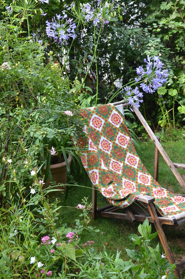 Der Liegestuhl meines Großvaters hat ein buntes Kleidchen bekommen und steht nun in unserem Garten.