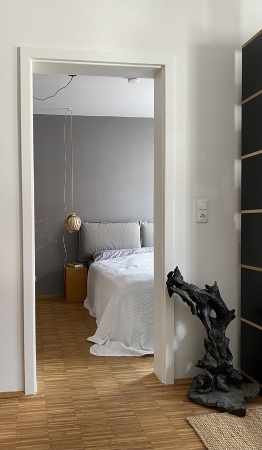 Muschellampe, Tageslicht, Schlafzimmer, Holz, Nachttisch