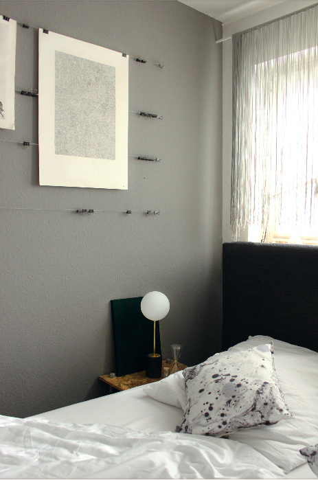 Bilderwand, Typografie, Poster, Nachtisch, Tischlampe, Bett, Schlafzimmer, Modern, mohnochrom, gray, Grau, Bettwäsche, schwarz weiß