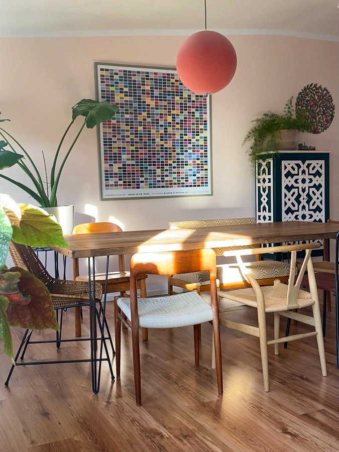Morgensonne, Tisch, Esstisch, Stühle, Stuhlmix, Pflanzen, Bild, Wanddeko, Lampe