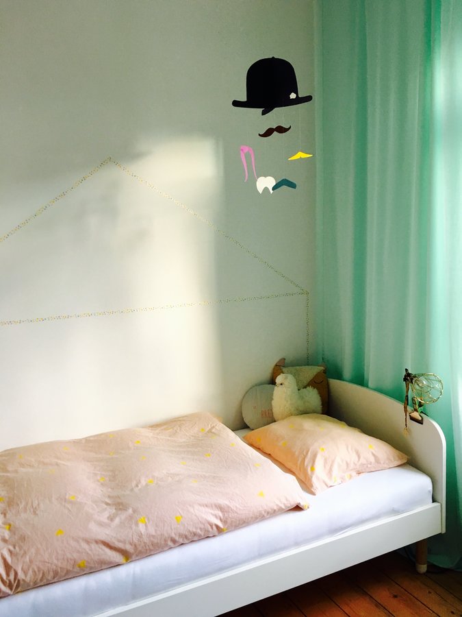 Kinderzimmer, Kinderzimmer Mädchen, Bett, Bettwäsche, ferm living, Kissen, Diy, Washi Tape, Mobile, Altbau, Dielen, Klemmlampe