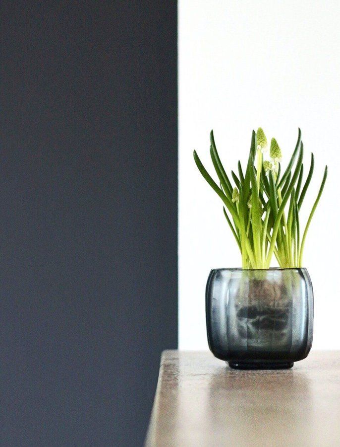 Blumendeko, Frühlingsdeko, Traubenhyazinthe, Glas, Glasvase, Blauschwarz, Weiß