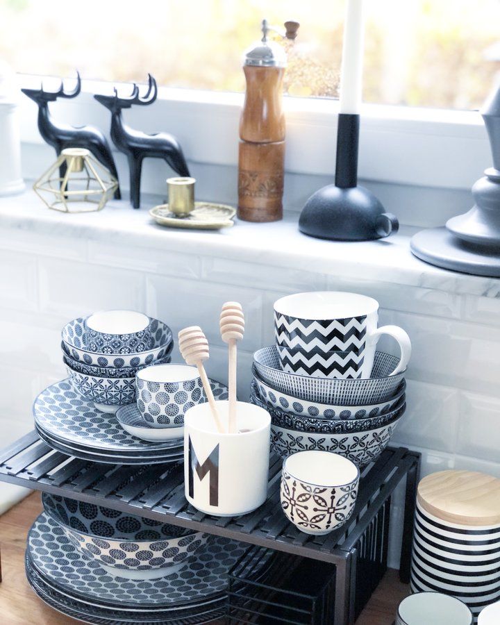 Geschirr, Teller, Tassen, Küche, Küchenaccessoires, Schwarz weiss, Muster, Kaffeemühle