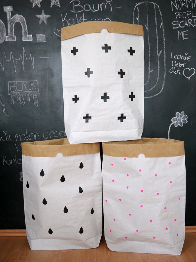 Papier, Papiersack, Sack, restmüll, Kinderzimmer, Tafellack, Tropfen, Punkte, Dots, Kreuze, Diy, Deko, Dekoration, abfall, Pink, Schwarz, Weiß