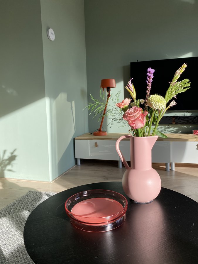 Nach Jahren von Grau und Schwarz gibts es mehr Farbe ins Wohnzimmer. Nie gedacht das grüne Wände und ein orangefarbenes Lamp mich gefallen wurde.