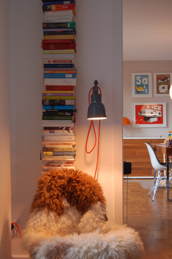 Rocker-Eames plus Fell plus Fußteil (kleiner Turnkasten) plus Beleuchtung = ganz ordentliche Leseecke...