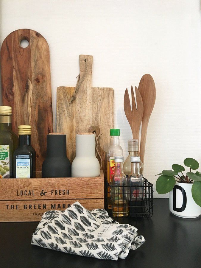 Küchenutensilien, Küchenutensilo, Küchenaufbewahrung, Küchenaccessoires, Holzbrett, Holzbox, Drahtkorb, Essigundöl, Küche, natürliche Materialien, Skandinavisch, skandinavisch Wohnen, Skandinavisches Design, Holz