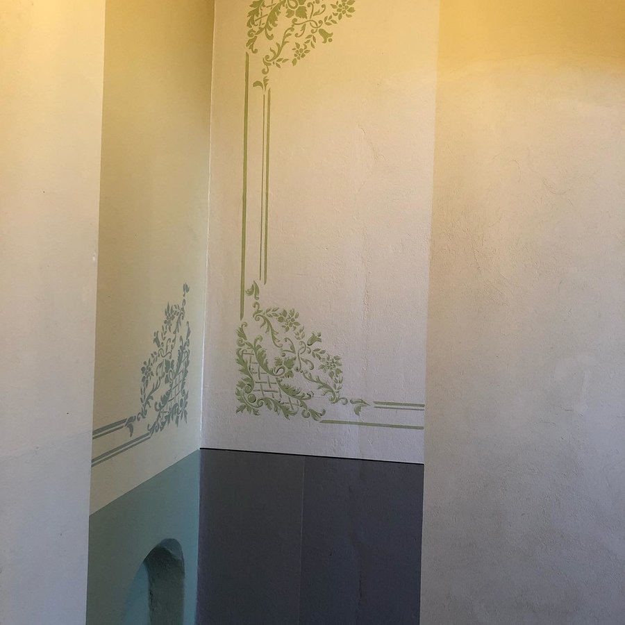 Neue Probeachsen fürs Treppenhaus und die Ornamentmalerei. Das Farbkonzept steht! Es war ein sehr langer Prozess, die Farbtöne changieren, die Lichtverhältnisse an den Wänden sind so verschieden, so daß es ohne ein 1:1 Farbmuster nicht beurteilt werden kann.