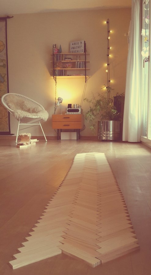 Meine Jungs haben aus "Kapplahölzchen" auf unserem Parkett einen wunderhübschen Fischgrat-Parkett gelegt- würde mir viiiel besser gefallen als unser herkömmlicher