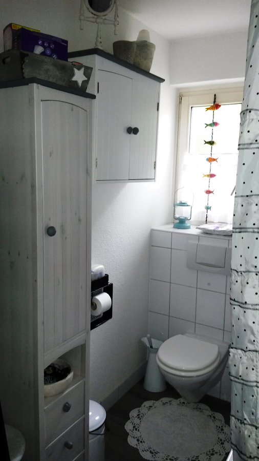 In Eigenarbeit mal eben ein "neues" Badezimmer "gezaubert". Schnell mal Klick vinyl besorgt und alles ein wenig umgebaut, angepinselt und bestellt. Der Kommentar von meinem Mann war: "Und Du wolltest nur nen neuen Duschvorhang." Aber das Ergebnis mag er auch ;-)