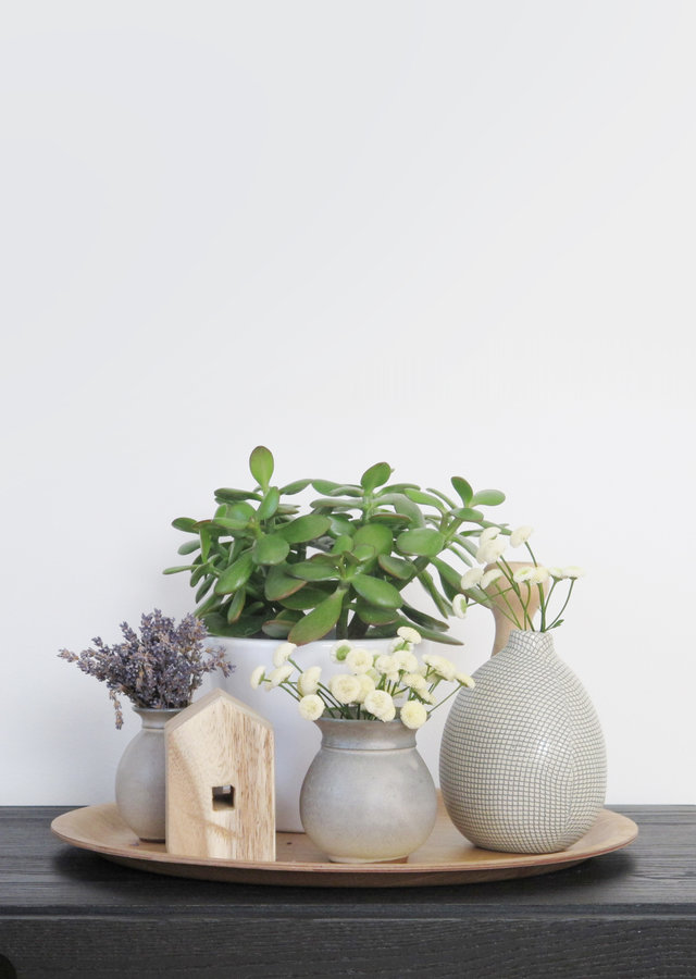 Auf diesem Tablet von Habitat, serviere ich euch heute: Blaue-Graue Zwillingsvasen vom Flohmarkt an Holzhäuschen und Sukkulente aus dem Bestand, umgeben von bauchiger Vase und einem feinen Kerzenständer aus dem Allgäu