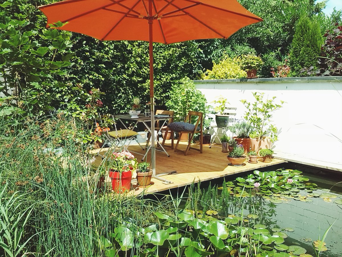 Garten, Grün, Idylle, Sonnenschirm, Seerosen, Teich, Terrasse, Sommerstuhl, gartenteich, Gartenmöbel, Gartentisch, Gartenstuhl