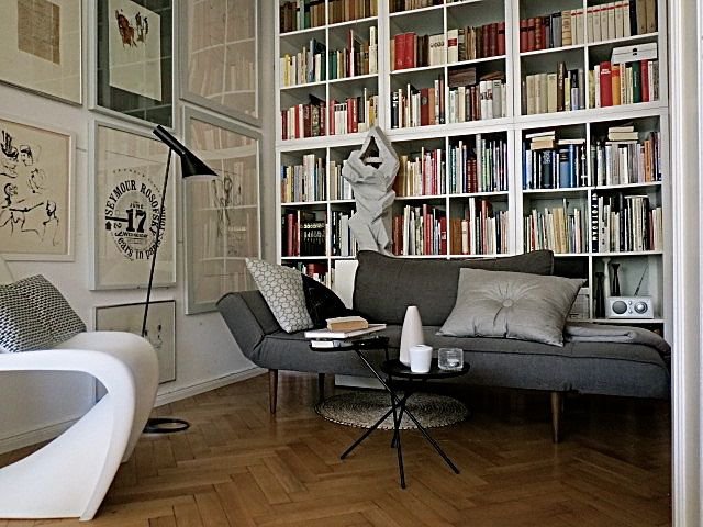 Innovation Daybed, Panton Chair, Softline Beistelltisch, AJ Leuchte, Ikea Kallax