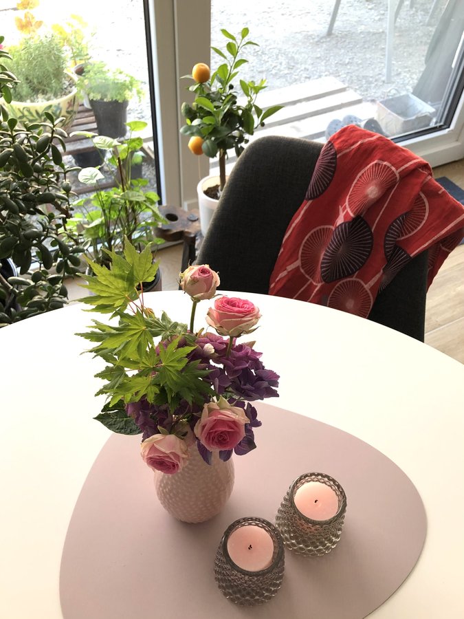 Wohnzimmer aktuell, Esstisch, Blumen, Polsterstuhl, Kleid, Freude