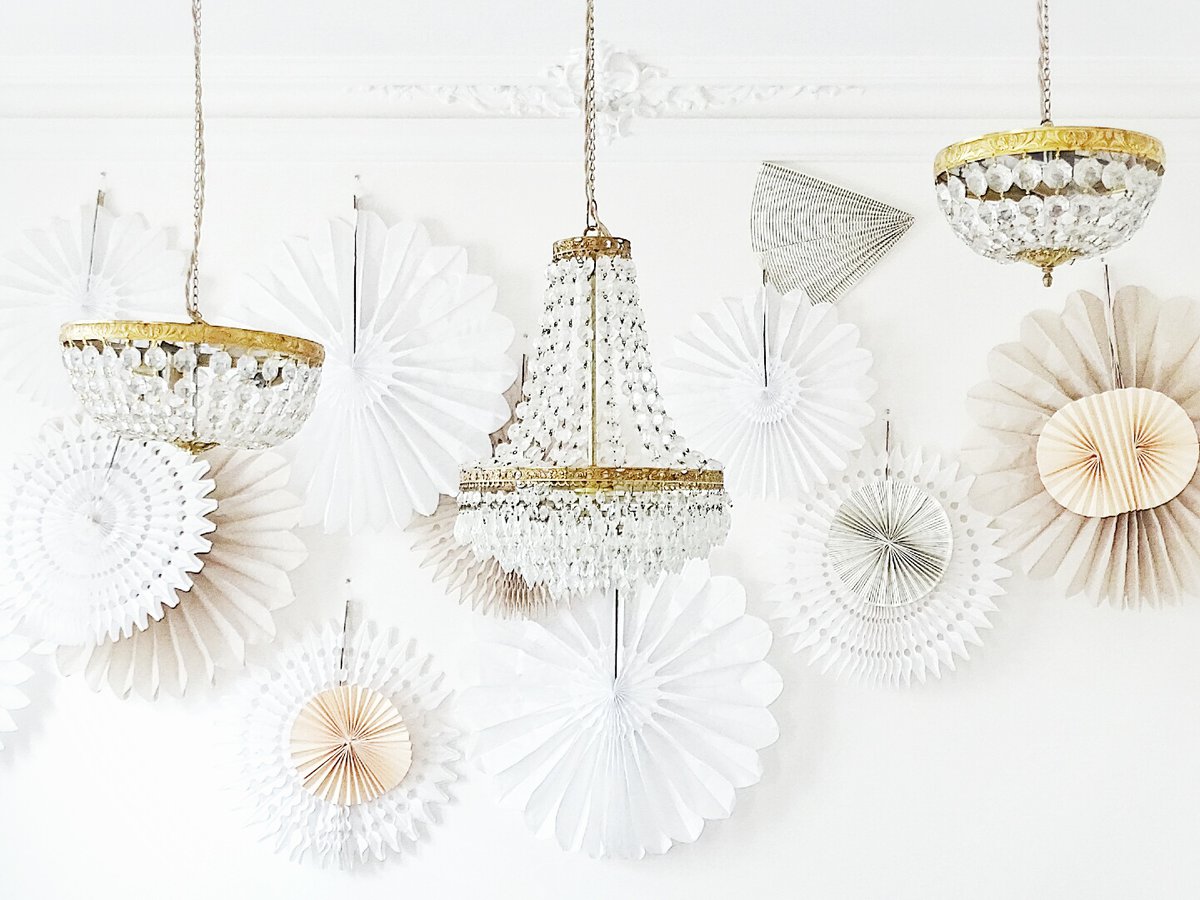 Paris, Ferienwohnung, Lampen, Kronleuchter, Lüster, Papierrosetten, Papier, Wanddeko, Deko, Papierdeko, plissee