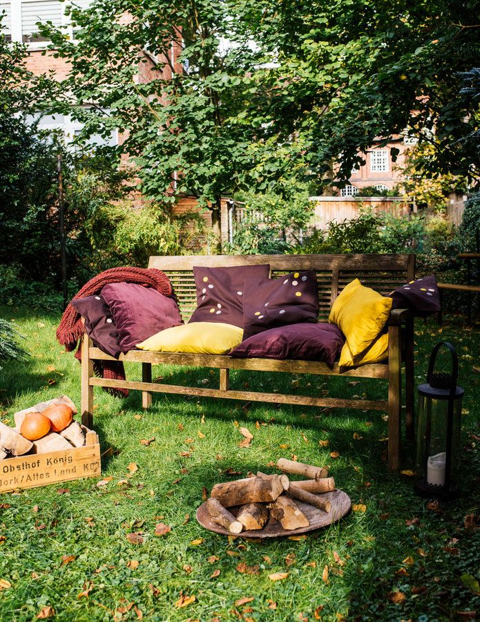 Herbst, Garten, Bank, Herbstfarben, Gelb, Rot, Aubergine, Kissen, DIYKissen, Samt, Filz, Herbst im Garten, Feuerschale, Feuerholz, Kürbis