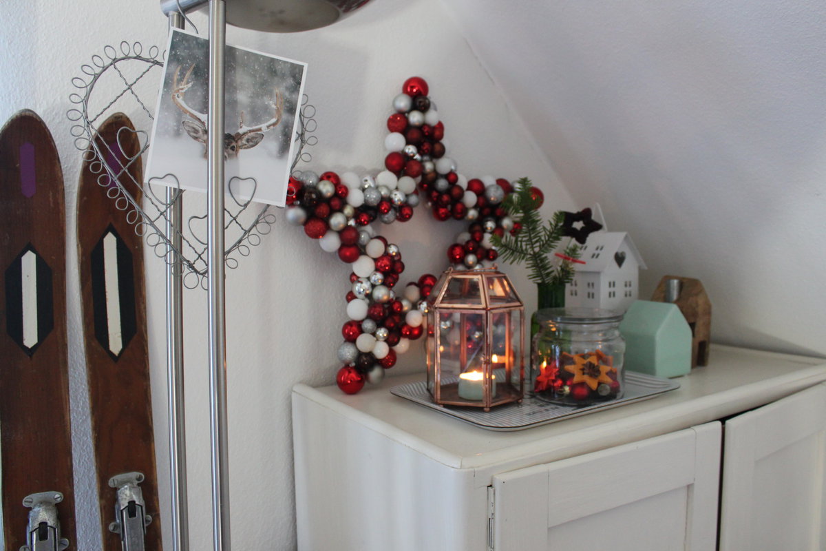 Weihnachtsdeko, alte Holzskier, Kupfer, laterne, Kugelstern, Lichterstern, Drahtherz, Hirsch, Glas, Rot, Mint, alte skier, Kugelstern