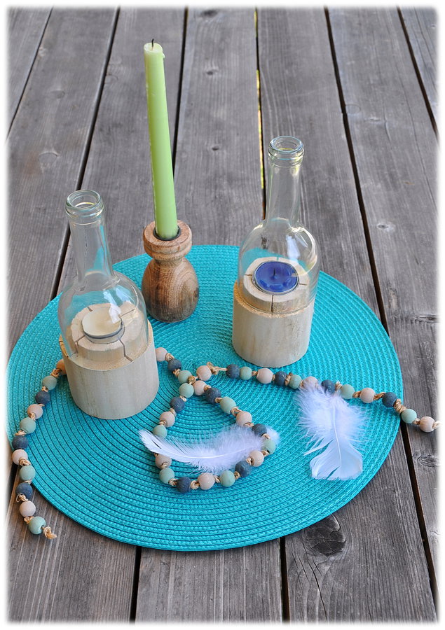 Kerzenständer, holzlaternen, Tischset, Terrasse, Türkis, Aquatöne, Holzperlenkette, Federn