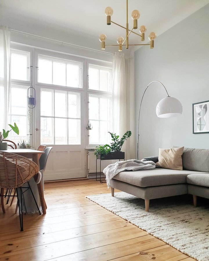 Altbau, Holzboden, Wohnzimmer, Esszimmer, Sofa, Recamiere, Teppich, Hängeleuche, Fenster