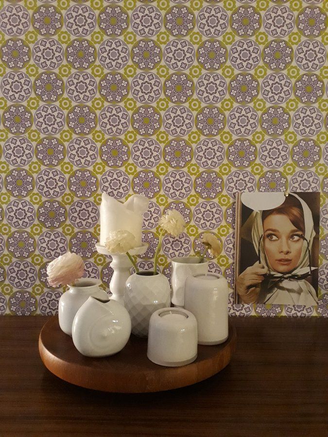 Vintage, Tapete, 70er Jahre, Vasensammlung, Midcentury, Teak, flower power, Kitsch, Ranunkeln schon verwelkt