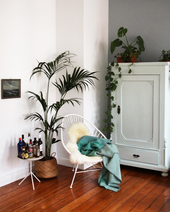 Wohnzimmer, Sessel, Stuhl, Zimmerpflanzen, Wandfarbe, Blau, Schrank