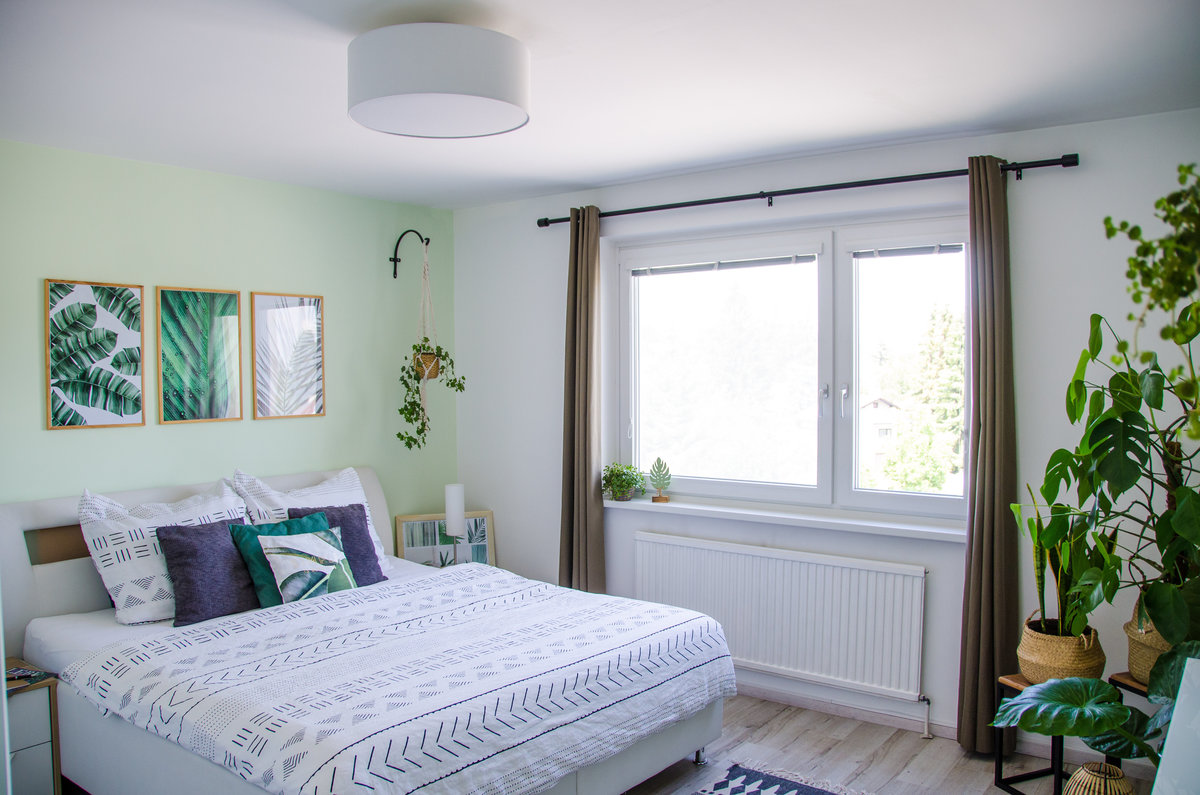 Urban Jungle, Zimmerpflanzen, Blumenampel, Makramee, Bilderwand, Pflanzenbilder, Vorhänge, Gardinen, Gardinenstange, Schlafzimmer, Boho, Ethno, Schlafzimmeridee, Wandfarben, Bettwäsche, Ruheort, Rückzugsort, Entspannung, Pflanzenliebe