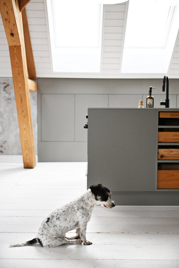 Küche, Loft, Hund, Dielenboden, Holzbalken, Dachfenster, Velux