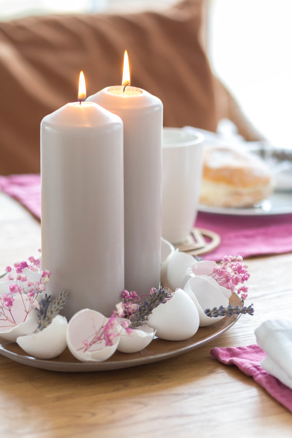 Tischdeko, Diy, Ostern, Eierschalen, Ideen, Kerzen, Trockenblumen
