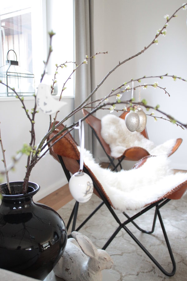 Wohnzimmerdeko, Vase, Lederstuhl, Fell, Hase, Osterdeko, Grau, Osterstrauch, Wohnzimmer