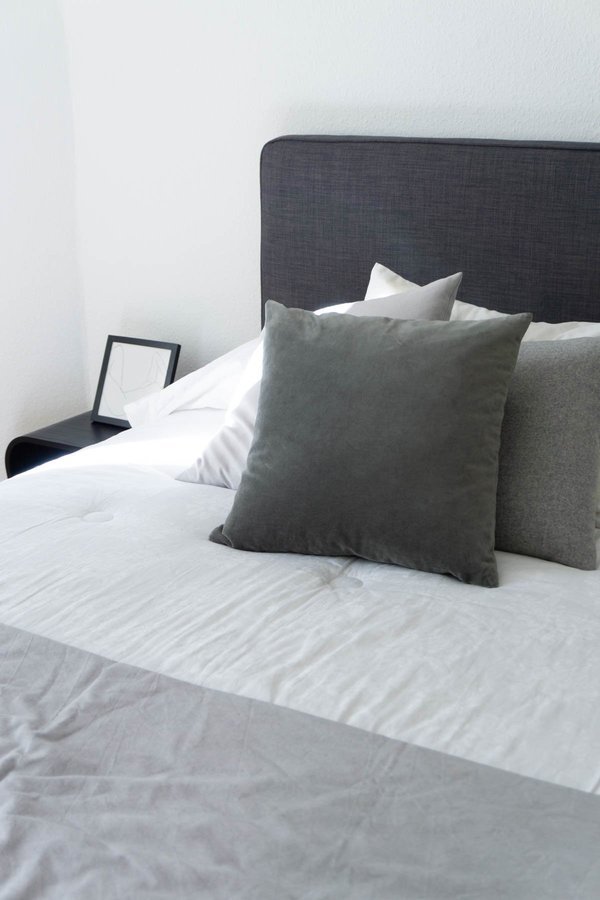 bedroom, Bed, pillows, Grey, White, Scandi, Scandinavian, Minimalistisch, Ikea
