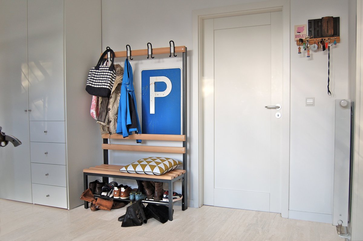 Es gibt so viele tolle Garderobenhakenleisten, angefangen vom 'Hang it all' - bloß haben diese wandnahen Haken alle das Problem der an der Wand schubbernden Jacken/ Taschen/ Pipapo, wenn die Wand nicht gerade aus Holz, nacktem Beton oder Paneelen besteht: diesem ständigen Schubber-shabby-schick an der Gardedobenrückwand begegnen wir jetzt mit diesem ollen Parkplatzschild vom Garagendachboden (die Tasche hängt nur fürs Bild am falschen Haken :wink☺️