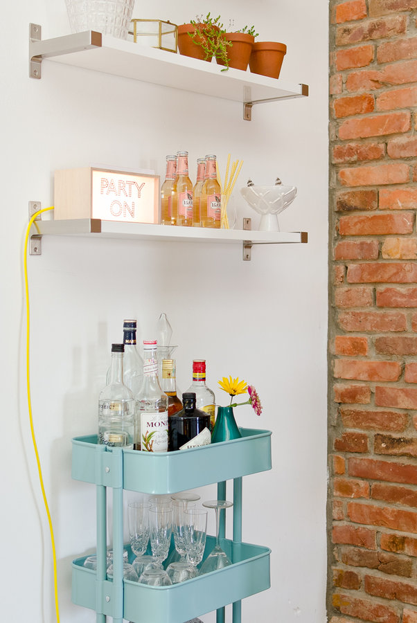 Hausbar, Ikea Rollwagen, Backsteinwand, Deko