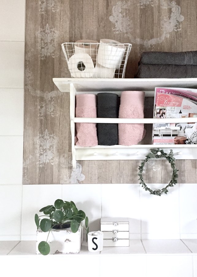 Badezimmer, Bad, Regal, Tellerregal, Tapete, pilea, Weiß, Rosa, Grau, ThinkPinkUndSo