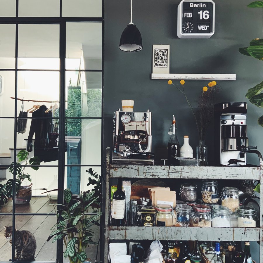 Café, Kaffeebar, Vintage, Flipclock, Industrial, industrialstyle, Letterpressprint, Küche, Küchenregal, Küchendeko