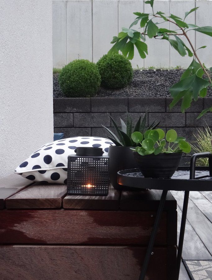 Terrasse, Gartenausschnitt, Regenpause, Holzdeck, Pflanzen, Urban Jungle, Schwarz, pilea