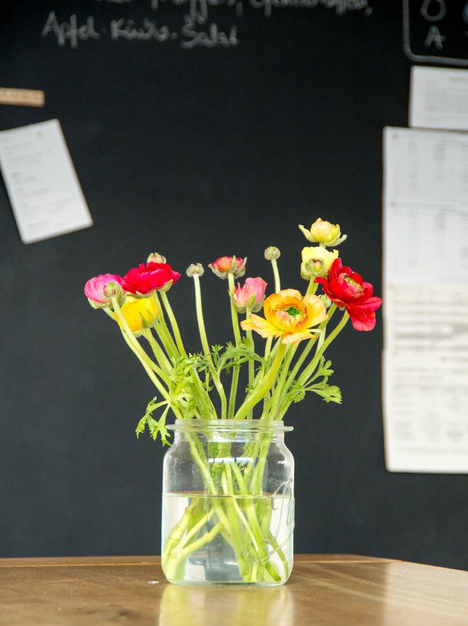 Blumen, Blumenstrauß, Vase, Holztisch, Einmachglas, Tafel, Ranunkeln, Bunt, Blüten