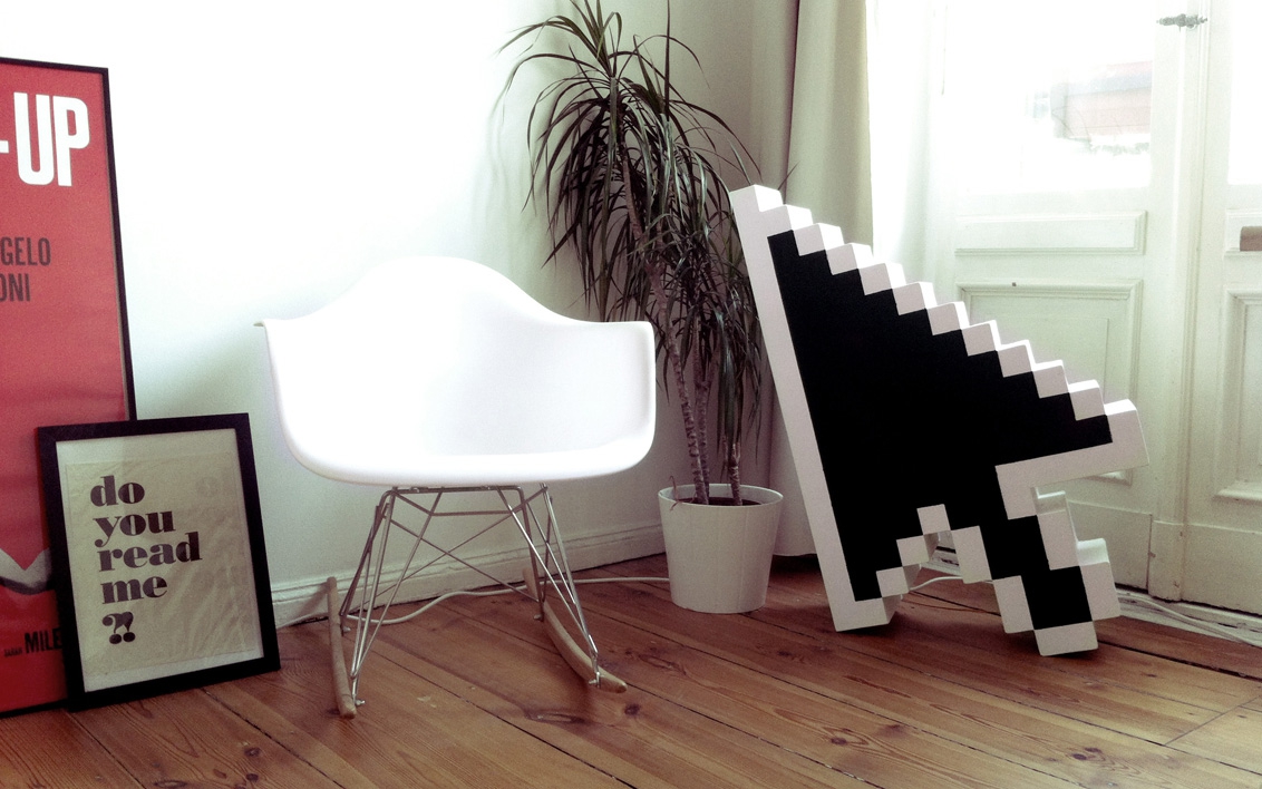 Hier ist aus Sperrholz, Leim und Lack ein nerdiges Dekoelement entstanden. Ein Cursor fürs echte Leben. Zum anschauen und Sachen draufstellen.