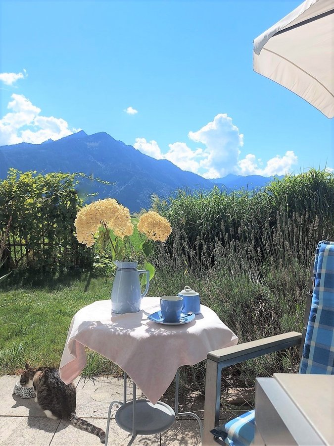 Garten, Terrasse, Terrassenmöbel, Tischchen, Hortensien, Kaffee, Sonnenschirm, Gräser, Wein, Berge, Sommer, August