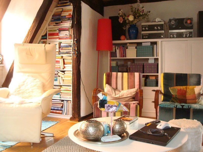 Jori Relaxsessel, Slim sophie, Revox Anlage, Einbau Bückerregal vom Schreiner, Rimini Blu Vase