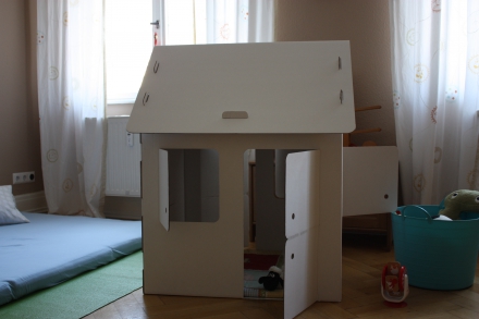 Mein Sohn hat zum 1. Geburtstag ein Papphaus bekommen - er liebt es! Nun wartet es auf jede Menge Spielzeug und natürlich einen bunten Anstrich. Ich denke an ein mit Stoff bespanntes Dach, schwarz/weiße Streifen, Tafelfolie und viele, viele bunte Aufkleber.... Ergebnisse folgen