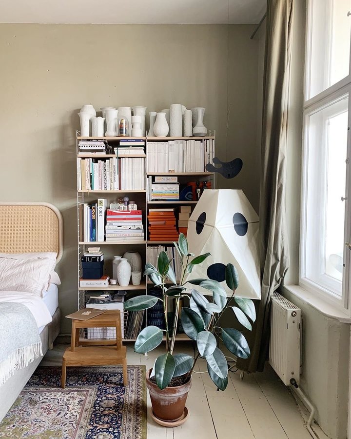 Schlafzimmer, Altbau, Holzboden, Betthaupt, Regal, Vasensammlung, Bücherregal