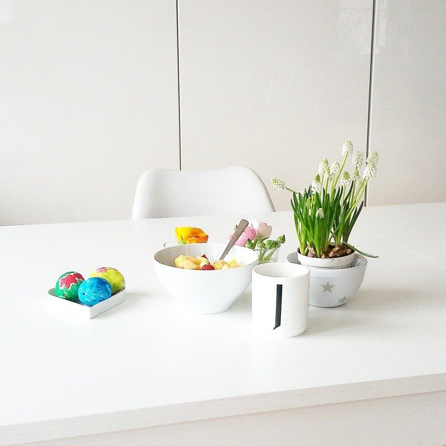 Selbst gefärbte Eier des Kindes, bunte Blümchen und ein spätes, spätes Frühstück...